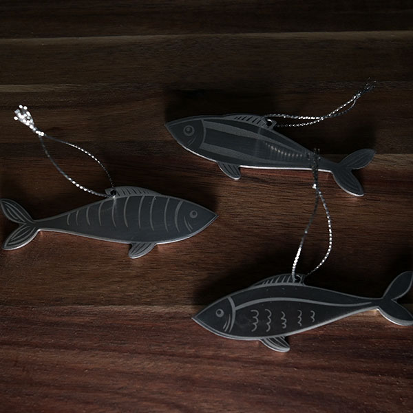 A la recherche de décorations originales, à suspendre dans le sapin de NOël, ces sardines en aluminium ont l’éclat des écailles de poissons au soleil. Une gravure fine, ajoute des détails pour obtenir trois sardines au design unique.